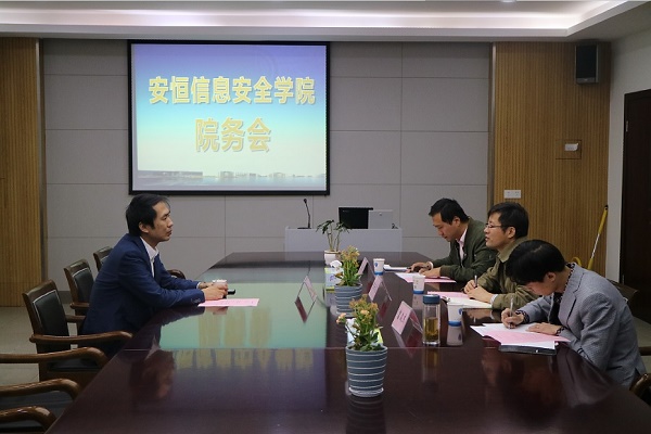 11月1日下午,安恒信息安全学院院务委员会会议在信息工程学院1203会议室召开。杭州安恒信息技术有限公司副总裁冯旭杭,信息工程学院院长陈云志,信息安全与管理专业负责人宣乐飞、专业助理富众杰参加了此次会议。会议由宣乐飞主持。