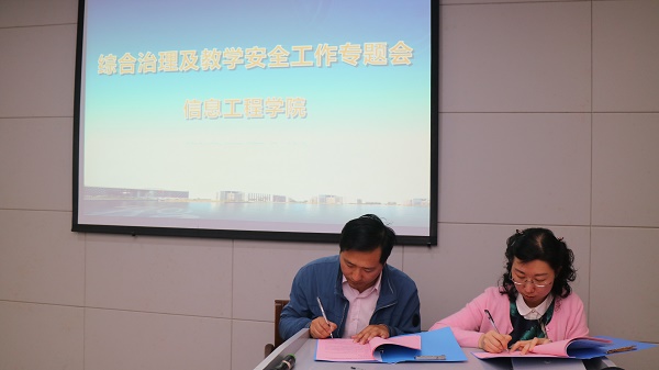 4月25日下午,信息工程学院在会议室召开社会治安综合治理专题工作会议。党总支副书记沈音乐、副院长郝阜平以及各部门负责人参会。