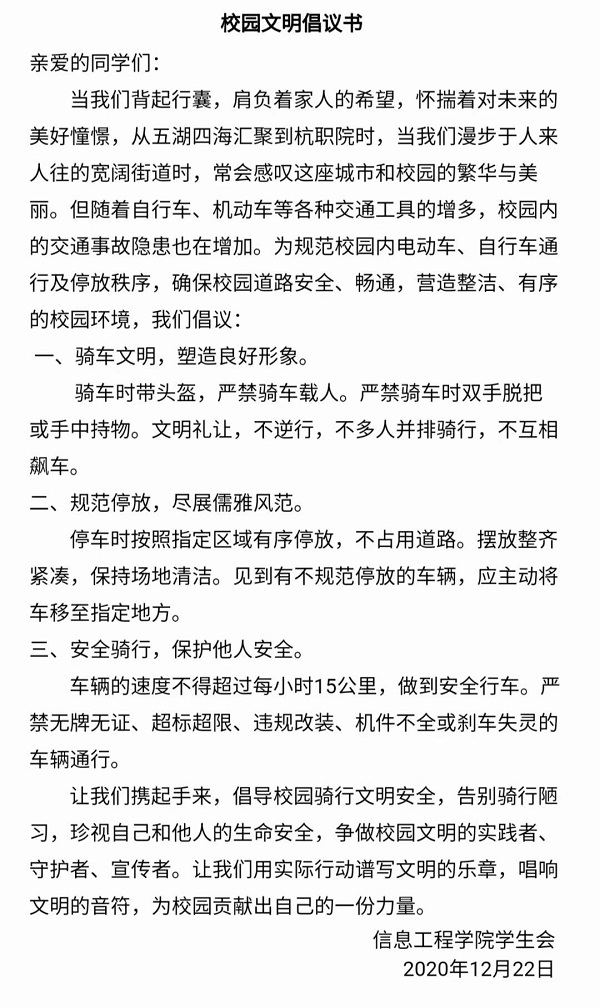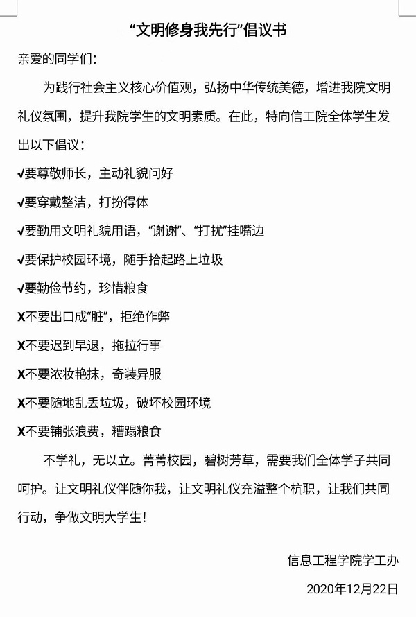 为践行社会主义核心价值观,推动形成积极健康、文明向上的校园生态,全面提升青年学生的文明素养,12月22日,信工院组织开展了“明礼修身 e网接力”文明修身主题活动。
