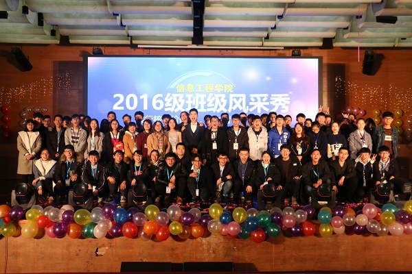 信息工程学院班级风采秀已历经9年历史,这个舞台大胆鼓励班级以多种表现形式秀出班级气质,打造“班级名片”,每一届学生参与率百分之百,充分打造了文化活动品牌,体现了信息工程学院的文化魅力。2016级班级风采秀以“践行核心价值观 助力青春中国梦”为主题,经过2016级各班级近两个月的辛勤排练,最终呈现出了一台形式多样,精彩不断的欢乐演出。其中有歌舞剧、歌朗诵、光影剧、情景剧等,还有中途的观众互动环节和最后紧张刺激的抽奖环节,创意的设计和温暖的团队氛围给现场所有人都带来惊喜,尤其是出现在舞台上熟悉的教师面孔和班助身影,更是让现场充满感动,信息工程学院此刻就是个大家庭,其乐融融。