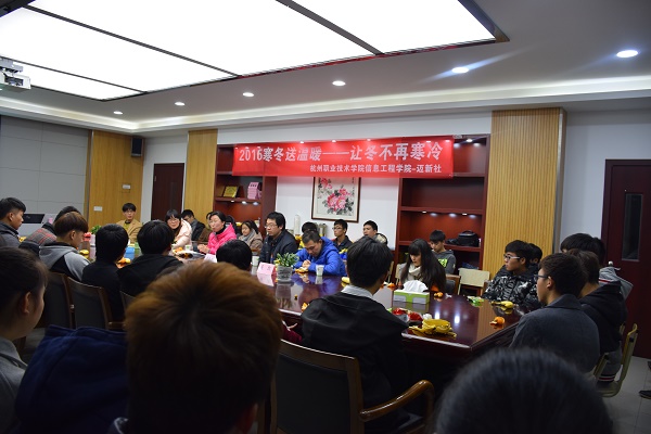 12月30日,由迈新社举办的信息工程学院2016年“寒冬送温暖”活动在信工学院1216会议室进行。出席本次活动的有信息工程学院总支副书记沈音乐、学工办主任章春军、迈新社指导老师邬亚培、辅导员吴凯和邓晓南老师、以及信工2016级的贫困生。