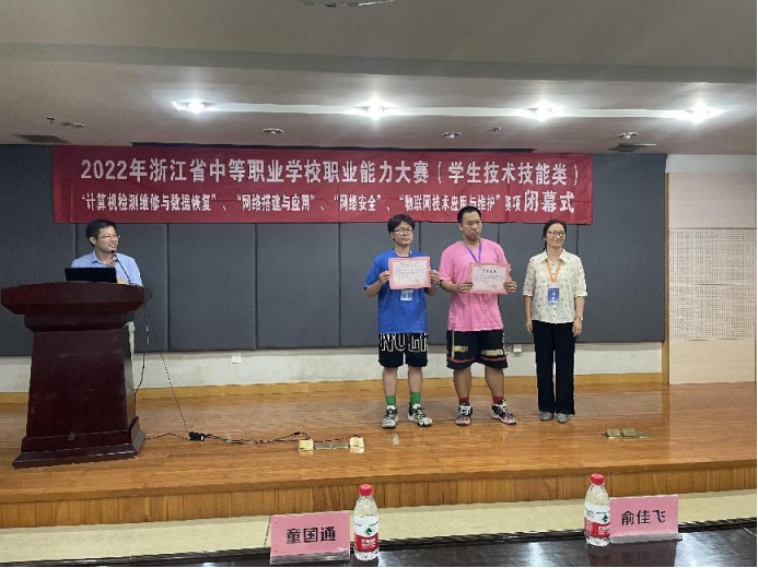 7月9日晚上,大赛闭幕式在我校行政楼117会议室举行。省职成教教研室教研员俞佳飞,我校教务处处长童国通,网络安全赛项裁判长刘成,计算机检测维修与数据恢复赛项裁判宣乐飞、网络搭建与应用裁判吴兴法出席,闭幕式由信息工程学院院长陈云志主持。闭幕式上,陈云志向为本次比赛付出辛勤劳动的全体指导老师、参赛选手、裁判员、工作人员表示了感谢,希望所有参赛队伍以赛促教、以赛促学、以赛促练,进一步提升职业技能和专业素养。各赛项裁判对相应赛项进行了点评和指导。最后,陈云志宣布了比赛结果和获奖名单,俞佳飞、童国通、裁判分别为各赛项获奖选手颁奖并祝贺。
