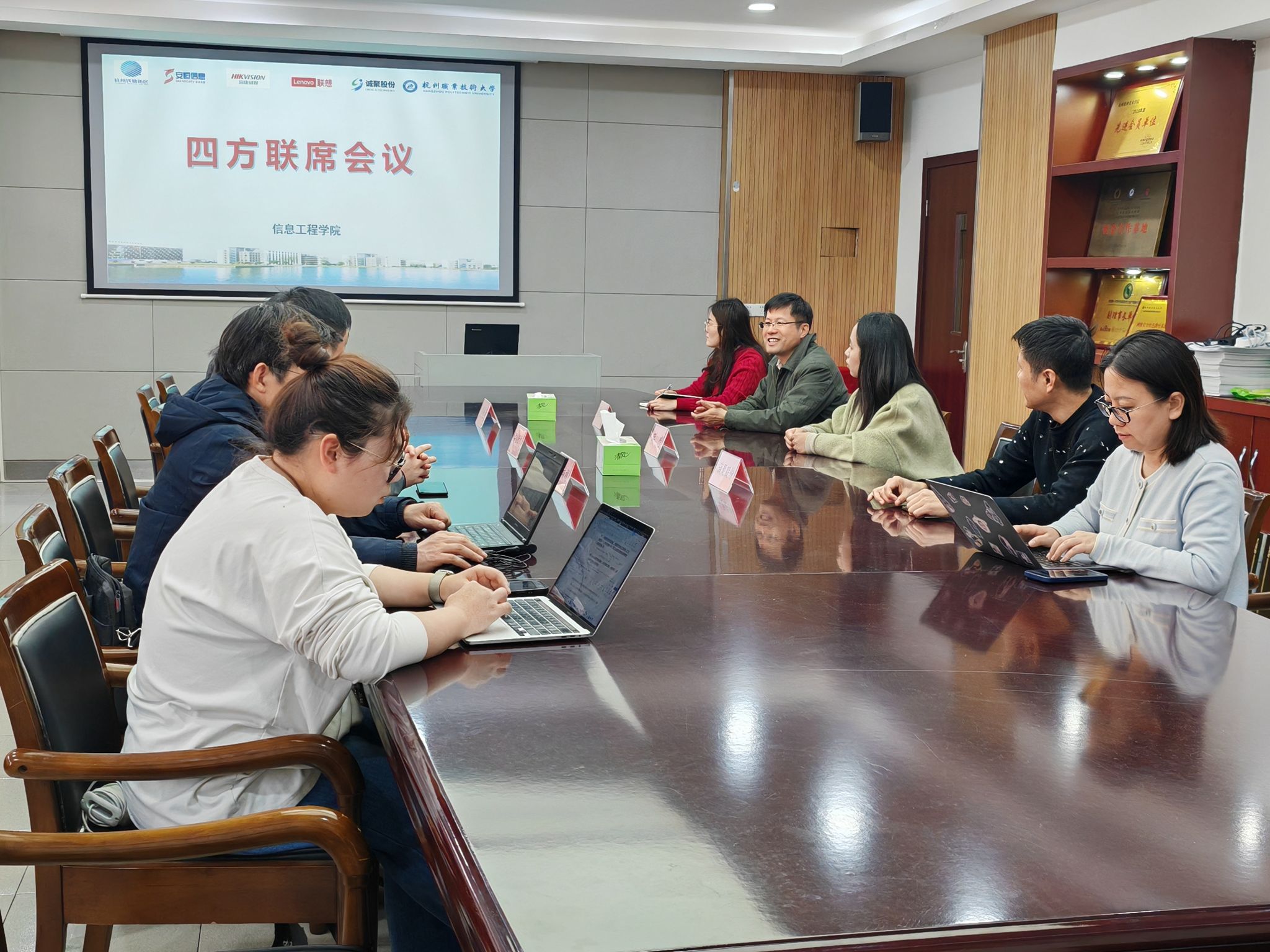 12月17日下午,在钱塘区政府的积极协调与大力支持下,杭州职业技术大学充分发挥引领作用,牵头组织联想新视界(浙江)工业互联网研究院有限公司、杭州安恒信息技术股份有限公司、浙江诚聚自动化科技股份有限公司以及杭州海康威视数字技术股份有限公司,成功召开了四方联席会议。此次会议由信息工程学院陈云志院长主持,政府与企业代表参加,会议聚焦双高校建设与校企合作,旨在搭建深度合作桥梁,实现资源共享、优势互补。