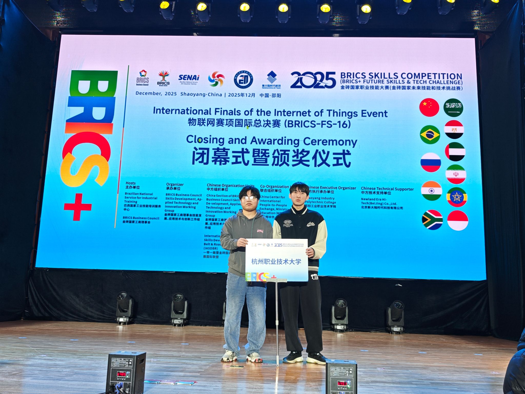 12月12日至14日,由巴西国家工业技能培训服务中心、金砖国家工商理事会主办的2025年金砖国家职业技能大赛物联网赛项国际总决赛在湖南邵阳工业职业技术学院圆满落幕。信息工程学院物联网专业学生姜俊帆、蒋烨峰(指导老师葛海江、彭斐)凭借扎实的专业功底与出色的临场表现,从来自全球的82支参赛队伍中脱颖而出,荣获国际总决赛二等奖。